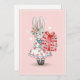 An adorable illustrated bunny in a floral dress offers a cherry-patterned gift on a pastel pink backdrop, symbolizing love, gifting, and cheerful celebration. Perfect for Valentine, spring, and greeting cards.