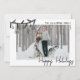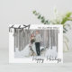 Envía alegría navideña con esta tarjeta de vacaciones plana horizontal. La parte delantera destaca una gran foto, acentuada con un lazo de garabatos negro de vegetación de pino y adornos colgantes en la esquina superior izquierda, que se superpone ligeramente a la imagen para dar un aspecto informal y dibujado a mano. La parte superior derecha tiene espacio para sus nombres o el nombre de la familia y el año en una simple fuente manuscrita negra, mientras que la parte inferior derecha presenta “Felices Fiestas” en un estilo de caligrafía script negra.