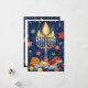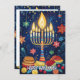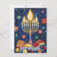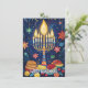Esta tarjeta de saludo de Hanukkah es una celebración vibrante del Festival de las Luces, que presenta una menorah bellamente ilustrada con velas brillantes contra un cielo nocturno azul profundo. Alrededor de la menorah hay símbolos festivos como dreidels, gold coins (gelt) y sufganiyot (donut rellenos de gelatina), todo añadido a la alegre atmósfera. El fondo está salpicado de estrellas y adornos que realzan el ambiente festivo.