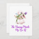The Bunny Made Me Do It con un conejo sosteniendo flores en una tarjeta de Pascua.