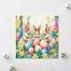 Three little Easter bunnies look over a clutch of pastel-colored Easter eggs in a clearing of spring flowers. Very cute!