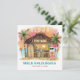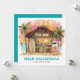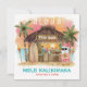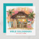 Tropical Christmas card features Santa enjoying a vacation at a Tiki bar on the beach at sunset with palm trees, holiday string lights and Hawaiian "Aloha" and "Mele Kalikimaka" greetings. Tropical cocktails, a pineapple, hibiscus and palm leaves, a surfboard and a parrot in a pirate hat decorate the bar area. The reverse side is turquoise blue-green, and the greeting and names can be personalized. Art by KL Stock