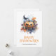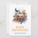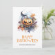 Tarjeta acuarela de Halloween con calabaza espeluznante y coloridas hojas de otoño. Personalice fácilmente esta tarjeta personalizado de Halloween con su nombre y texto familiar.