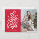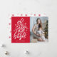 Elegante y moderna tarjeta de fotos de vacaciones con la frase "Todo es tranquilo, todo es brillante" en un guión blanco con letras a mano con acentos de estrella contra un fondo rojo brillante. Personalice la parte delantera de la tarjeta de vacaciones con letras a mano agregando su nombre y la foto favorita. La tarjeta se revierte a un patrón de copos de nieve rojos y blancos con ráfagas de estrellas.