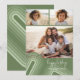 Delante - Un simple collage de 3 fotos con un toque de líneas retro curvadas en tonos verde enebro. El saludo está en una delgada letra manuscrita con mucho movimiento. Añada su firma familiar sobre las rayas pastel para un diseño de tarjeta de vacaciones no tradicional. Atrás - Un arco de rayas retro simple y limpio en tonos verde enebro.