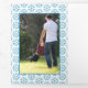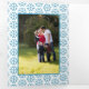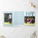 Alegría a los Navidades de copos de nieve purpurina azul del mundo tarjeta de vacaciones Tri-Fold. La portada muestra el texto: "Alegría al mundo" y un copo de nieve en purpurina azul. También hay fotos en la solapa y en el interior izquierdo y derecho con un borde de patrón de copo de nieve. Fotografía © Storytree Studios, Stanford, CA