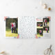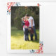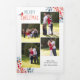 Bayas de coral con hojas polvorientas azules y Navidades de pájaro cartón de fotos de vacaciones de tres letras plegadas. La portada de esta tarjeta incluye el texto "Feliz Navidad" y un collage de fotos de cuatro fotos. Las esquinas están cubiertas de corales y bayas rojas y hojas azules. La solapa muestra una foto de tu familia, bayas y un pájaro. En el interior, en el medio, se muestran sus deseos y, de nuevo, el texto "Feliz Navidad" en un marco hecho de bayas. Los paneles interior izquierdo y derecho muestran un patrón de puntos de polka con copos de nieve en azul y blanco polvoriento con una foto en cada uno. Fotografía © Storytree Studios, Stanford, CA