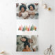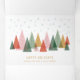 Un diseño minimalista que muestra un colorido bosque de árboles estilizados y geométricos bajo copos de nieve en caída. Los colores vivos y las formas modernas crean un ambiente festivo y alegre.
