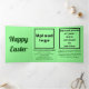 Triple tarjeta de vacaciones que puedes personalizar para poner tu nombre de negocio, otra información de tu negocio y con saludo de Pascua. Personalizar y úsalo para saludar a sus clientes o clientes en estas vacaciones de Pascua. También puede utilizarlo como material de marketing para promocionar su negocio o promocionar su marca. Tarjeta de vacaciones triple de personalizable que se puede usar para crear conciencia de marca. Los colores de diseño son textos de color verde oscuro sobre fondo verde claro. Para personalizar de esta tarjeta, cargue el logotipo de su empresa y la foto de su producto o servicio principal, escriba su nombre de negocio, dirección, número de teléfono, correo electrónico, página web o social y breve descripción de su negocio y productos o servicios. Breve descripción que atraerá a los clientes a comprar sus productos o clientes para que les gusten sus servicios. Después de subir el logotipo y escribir textos, por favor compruebe el aspecto exterior y el interior. Si la apariencia le resulta agradable, puede realizar su pedido ahora. Si necesita cambiar el tamaño y mover el logotipo y los textos para que encajen en esta tarjeta, cambie la herramienta de diseño. También puede realizar otros cambios en la herramienta de diseño según el aspecto de esta tarjeta que prefiera, como cambiar el color de fondo, el color de fuente y el estilo de fuente. ¡Feliz Pascua! Te deseo más ventas esta festividad de Pascua.