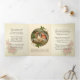 Esta encantadora tarjeta de Navidad de tres solapas presenta una hermosa impresión religiosa católica tradicional vintage personalizada de la Virgen María, San José y ángeles mirando al Niño Jesús mientras yace en el pesebre. En el interior hay un hermoso poema sobre el Nacimiento superpuesto en una vela de Navidad acentuada con poinsettia y rosario santo.