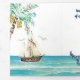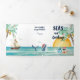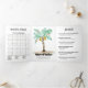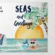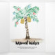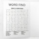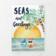Comparte divertidos y festivos saludos con esta tarjeta de Navidad plegable en tres partes que presenta un juego de búsqueda de palabras con tema de playa, chistes y un paisaje marino en acuarela que incluye a Santa, una sirena, una ballena, un barco y árboles de Navidad de palmeras. La portada presenta a una sirena y a Santa (con una bebida tropical de piña) en el océano, un título "Seas and Greetings" en azul náutico, y un árbol de Navidad de palmera. El interior presenta un juego de búsqueda de palabras a la izquierda y chistes a la derecha. El centro del interior presenta una palmera decorada con adornos y luces, un saludo de "Warmest Wishes" y dos líneas de texto que puedes personalizar. La parte trasera presenta una ballena con un sombrero de Santa, gaviotas y un saludo de "have a Whale of a