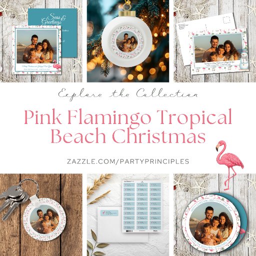 Send warm holiday wishes from your personal paradise! This vibrant Christmas card features a cheerful tropical background filled with pink flamingos, whimsical snowmen, sparkling snowflakes, and festive palm trees. Bright coastal colors create a joyful backdrop for your favorite family photo, making this card the perfect blend of beachy fun and holiday magic.