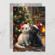 Two adorable, cute kitten with lovely faces - one white, one black, wearing Santa hats cuddle under the Christmas tree in the living room. Wonderful an cute motif for the season - fits for everyone! Custom back (Text, image).