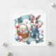 Un delicioso ilustracion temático de Pascua con un conejito con una expresión alegre. El conejo lleva overoles de denim con detalles rasgados, emparejados con una camisa de rayas rosas y blancas. La cabeza está decorada con un arco rosa a juego. El conejito ondea con entusiasmo, rodeado por un cartel azul que dice "Feliz Pascua". Junto a ella hay una cesta llena de huevos de Pascua coloreados a rayas y estampados, adornada con un arco rosa.