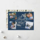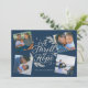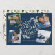 Una moderna tarjeta religiosa de vacaciones con la frase "Un Thrill de la Esperanza" en el centro sobre un fondo marino, rodeada por 4 de sus fotos favoritas. Al revés, se observa un patrón de hojas de pino y hojas de color verde y marino sobre un fondo de crema.