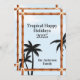 Una tarjeta de felicitación de vacaciones tropicales con cielo azul y siluetas de palmeras. Todo detrás de un marco de cuatro postes de bambú para un toque cálido y exótico. El texto sugerido "Feliz Vacaciones Tropicales 2025" se puede personalizar con la redacción de su preferencia, junto con el nombre de su familia.