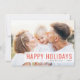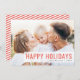 Hermosa tarjeta fotográfica de vacaciones con un banner simple, moderno y minimalista de citas de "Happy Holidays" en un divertido coral rojo festivo sobre un fondo semitransparente. Esta versátil tarjeta puede ser personalizada con su propia fotografía, nombre familiar y año para hacer una tarjeta verdaderamente única y a medida para la temporada de vacaciones. El diseño presenta un patrón de rayas de caramelo rojo coral en el reverso. La tarjeta muestra una imagen de ejemplo de una familia joven de 3. Estas imágenes están diseñadas como un marcador de posición para ser reemplazadas por tu foto o imagen familiar favorita.