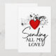 Texto editable que dice "Enviando todo mi amor". Perfecto para el Día de San Valentín. Corazón rojo con corazones de sello negro y script en el fondo. También disponible como descarga digital para uso personal solamente.