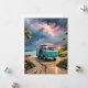 Una furgoneta está estacionada en una playa con flores de colores y árboles que la rodean, mientras las dramáticas nubes de tormenta se separan para revelar que la luz se desplaza por el cielo. El lugar contrasta con el ambiente turbulento y la tranquilidad de la zona costera.