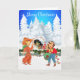 Vaquero y Vaquera con luces de soplo y un caballo parado detrás de la valla en una carta de Navidades de invierno. El texto que dice Feliz Navidad puede ser cambio, así como el saludo en el interior. También hay una línea de texto para los nombres o se puede borrar si prefiere firmar a mano sus tarjetas.