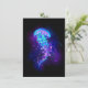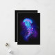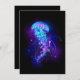 Gran medusa azul, de dibujo artístico, brillante y brillante, con largos tentáculos sobre fondo negro con bioluminiscencia violeta. Luminosas medusas.