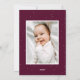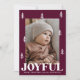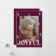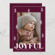 La tarjeta de vacaciones Joyful Trees Wine 2 Photo Holiday incluye una foto vertical enmarcada por elegantes pinos blancos dibujados a mano, en un entorno rico en vino. Las letras "alegres" en blanco resaltan el saludo de vacaciones personalizado y el nombre de la familia a continuación. En el reverso de la tarjeta se muestra una foto adicional sobre un fondo de vino a juego acentuado con sutiles puntos blancos, lo que hace de esta carta de Navidades personalizados una manera elegante y memorable de compartir los cálidos deseos de las vacaciones.