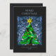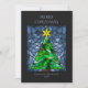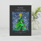 Estas hermosas tarjetas de felicitación de Navidades planos de 5" x 7" presentan un diseño de vidrio manchado de color de agua hecho a mano con un árbol de Navidad con una estrella dorada con ornamentos rojos con un fondo en tonos azules. El saludo editable es "Feliz Navidad". La parte de atrás tiene el mensaje editable, "Deseándote paz, amor y alegría esta temporada navideña", con marcadores de posición para tu nombre y año en un tipo de letra característico.
