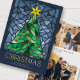 Estas tarjetas de felicitación de Navidades planos de 5" x 7", brillantes y coloridas, presentan un diseño artesanal de cristal de color agua de un árbol de Navidad verde con una estrella dorada y adornos rojos enmarcados en tonos azules sobre un fondo azul marino. El saludo es "Navidades", en grandes cartas decorativas con un saludo editable, "Deseándote paz, amor y alegría esta temporada navideña". La parte posterior de la tarjeta contiene un lugar para tres de tus fotos favoritas con marcadores de posición para tu nombre y año.