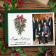 Modern Elegant Calligraphy Ink Script Watercolor Pines Winter Greenery with Burgundy Red Ribbon Bow Christmas Ornaments, Pine Cones and Holly Berries Company Photo Happy Holidays Card - Green