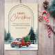 Send warm holiday wishes with this rustic Christmas card featuring a classic red vintage pickup hauling a fresh evergreen through a snowy pine forest. Framed by an elegant arched border, the front reads Merry Christmas with space to personalize your family name or greeting.