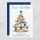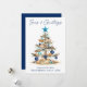 Modern Minimalist Elegance Calligraphy Ink Pen Handwritten Script Seas & Greetings Coastal Holiday Card includes a Watercolor Christmas Tree make of beach ocean driftwood, seashells, sand dollars, nautical anchor ornament and topped with a starfish. Navy Blue Back.
