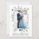 Elegante color de agua verde invierno y floral azul Boda navideña foto recién casada tarjeta de vacaciones incluye hojas de verdor botánico de invierno, bayas azules, flores azules, algodón y bayas rojas. Marco dorado. Dusty Blue and Gold Text. Dusty Blue de vuelta.
