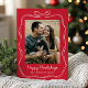 Send holiday cheer with this whimsical Happy Howlidays Christmas photo card featuring your photo framed by a hand-drawn white ribbon and bow. The playful design displays “Happy Howlidays” in a handwritten script on a festive red background. Personalize with your family name below and add a photo of your dog or a family portrait including your furry friend. The back includes space for an extra photo and message, creating a fun and heartfelt card for pet lovers.