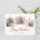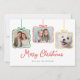 Extiende la alegría de temporada con esta elegante y personalizable tarjeta de vacaciones. Con tres recortes de fotos con adornos colgantes y arcos pastel, este diseño es perfecto para mostrar a tu familia, niños e incluso a tus amigos peludos. El fondo blanco limpio resalta el mensaje festivo "Te deseamos unas vacaciones felices", en un guión elegante, con el espacio debajo para tu firma personalizada. Una forma moderna y reconfortante de enviar amor y alegría a amigos y familia esta temporada de vacaciones.