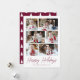 Tarjeta de vacaciones moderna con 6 fotos dispuestas en forma de collage. "Felices Fiestas" se muestra en un guión escrito a mano de color vino con el nombre de su familia y el año que se muestra a continuación. La tarjeta multifoto de vacaciones se revierte para mostrar un patrón de vino y árbol de Navidad blanco.