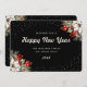 Black botanical New Year card featuring falling snow and a watercolor painting of poinsettia, holly and red berries.