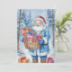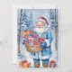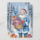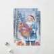 Este diseño presenta una figura vestida con un traje azul de Santa Claus, sosteniendo una canasta de mimbre llena de cajas de regalo rojas y blancas. Se colocan cajas de regalo adicionales en el suelo cubierto de nieve al lado de la figura. El fondo muestra un paisaje nevado con árboles altos y delgados y copos de nieve en caída. El atuendo azul no tradicional de Santa María le da un toque único a la escena de las vacaciones clásicas, evocando sentimientos de calidez y generosidad.