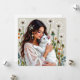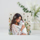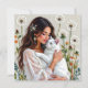 A pretty notecard that is blank on one side and the other has an illustration of a woman holding a white fluffy cat surrounded by dandelions, The picture has a crochet style fabric look.