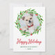 Esta hermosa tarjeta de Navidades fotográficos con una foto de su perro o hijo dentro de una hermosa corona de Navidades acuáticas, Felices Fiestas en un moderno guión de broche, tu apellido y el año serían perfectos para mandar a tus amigos y familia. A todos les encantará conseguir nuevas fotos de ti o de tu perro. Los tipos de letra son modernos y están limpios. En la parte de atrás hay una franja roja coordinadora con una bandeja de oro. Para hacer de esta tarjeta su propia, simplemente seleccione Personalizar esta plantilla, cargue su foto favorita y escriba su nombre y el año. ¡Es muy fácil! En sólo unos segundos verás tus únicas y fabulosas tarjetas de festividad fotográfica.