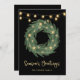 Estas elegantes y modernas tarjetas cuentan con una corona de flores de color bonito verde acuarela con acentos de estrellas de color dorado y elegantes luces de cuerda, con caligrafía de escritura moderna que dice "Saludos de temporada" en un fondo negro.