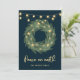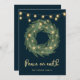 Estas elegantes tarjetas de diseño cuentan con una corona de bonito, una corona de color agua verde con acentos de estrellas de color dorado y elegantes luces de cuerda, con caligrafía de escritura moderna que dice "Paz en la tierra" en un fondo azul oscuro y medianoche.