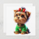 Adornado con un suéter verde y un arco rojo, este adorable Yorkshire Terrier le da encanto a sus celebraciones de vacaciones. ¡Perfecto para mandar cálidos deseos de Navidades!
