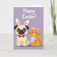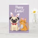 Designed with a soft lavender background, this card features two animated animal friends posed close together, their gentle body language suggesting easy friendship with a hint of romance. A light-furred dog sits low in the frame with wide-set eyes and a slightly wistful look, wearing a red bow tie and tall bunny ears lined in white and pink 🐰. Beside the dog stands an orange cat with a round, cheerful face, topped with small pink-and-white blossoms like a spring crown 🌷. The cat holds a decorated egg at chest level, patterned with neat blue-and-white stripes that draw the eye. Near the top, the words “Happy Easter!” appear in white lettering, centered and spaced above the characters for balance. The warm red bow tie and bright orange fur stand out against the cool purple backdrop, while the blossoms add a tender, affectionate touch between the two. Small highlights along the bunny ears, the egg stripes, and the flower petals give the scene a smooth, softly shaded finish.