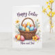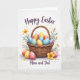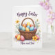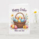 This greeting card features a rustic woven basket filled with colorful decorated eggs, arranged like a cozy little gift shared between loved ones 🐰. Each egg has its own pattern—tiny dots, gentle stripes, and small flower designs—mixing blues, oranges, pinks, purples, and yellows in a way that feels warmly connected. The basket is drawn in natural tan and honey tones, with a braided handle curving upward like an inviting arc. A few extra eggs rest near the base, nestled beside petite white daisies and larger yellow blooms that lean toward one another as if in quiet companionship 🌷. Behind the basket, leafy green stems rise up and frame the scene, adding soft movement against the white background. Near the top, “Happy Easter” appears in flowing dark lettering, centered above the basket. Along the bottom, “Mom and Dad” is placed in smaller, subtle text that sits neatly under the arrangement. The white background stays open and bright, making the basket’s warm weave and the eggs’ painted details stand out clearly.