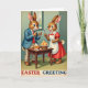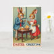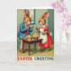 Designed with a vintage illustration style, the card shows two upright hare-like characters facing each other with an easy, affectionate closeness 🐰. On the left, the male figure wears a blue jacket over a white shirt with a red tie, holding two small glasses as if inviting a gentle toast. On the right, the female figure stands in a red dress with a white apron, spoon in hand, her relaxed posture suggesting she’s just stepped from the kitchen to meet his gaze 🐇. Between them sits a rustic wooden table topped with baskets full of eggs, mixing soft white shells with warm golden-orange ones, plus a few eggs scattered nearby. Their large blue eyes and small smiles create a quiet, friendly romance, like a shared joke held in the pause before the clink of glasses. In the upper area, simple lettering appears near the top in a matching red tone, standing out against the light background without crowding the scene 🌷. Behind them, a window frames a spring landscape of green fields and small blooming flowers, while their fluffy tails peek out at the edges of their outfits.