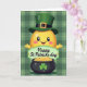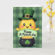 This greeting card features a cheerful, plump golden character with wide black eyes, rosy cheeks, and a big smile, wearing an emerald green leprechaun hat with a gold buckle. Its arms reach forward as if offering a friendly hug, giving the scene a cozy, companionable energy 💚. Across its hands sits a light green banner near the upper middle that reads “Happy St. Patrick’s day” in darker green lettering, with small decorative touches around the words. Below the character, a shiny black cauldron rests in the lower portion of the design, piled high with bright gold coins that catch the light. A green shamrock decorates the front of the pot, tying the colors together with a classic St. Patrick’s Day symbol ☘️. The background is a textured, hand-drawn plaid made from several shades of green, adding depth while keeping the main figures easy to spot. The gold character, banner, and pot are centered and stacked vertically, creating a simple top-to-bottom layout. Behind them, the green plaid lines crisscross in soft, uneven strokes with darker green accents.