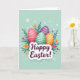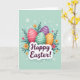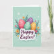 This design shows four decorated egg shapes grouped close together like friends leaning in, each with soft shading that makes them look gently rounded 🐰. One egg is bright pink with small white dots, another is deep purple with bands and scattered spots, a third is mint green with thin white stripes, and the last is warm orange with dotted markings. They sit among dark green leafy fronds that curl around them, creating a cozy, tucked-in feeling like a shared secret in a garden. The background is a light aquamarine wash, airy like an early spring sky, with tiny white circles and snowflake-like specks drifting around 🌷. Small five-petaled flowers in orange and soft pink are sprinkled between the leaves, adding little moments that feel like friendly glances across the scene. Near the lower center, a puffy white banner stretches horizontally, holding a short Easter greeting in deep purple lettering. The message sits centered on the banner, with the purple standing out clearly against the white shape and the pale blue behind it. Around the banner’s edges, the green fronds and a few tiny white specks overlap the space, while the four eggs remain clustered above in the middle.