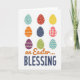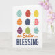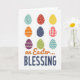This design shows a white background topped with a neat 3x3 grid of nine decorated eggs that fills about the upper two-thirds of the card, like a shared spring display between friends 🌷. Each egg has its own color and pattern—teal with curling swirls, deep plum with zigzags, coral pink with small ivory hearts, and other mixes that feel like little notes passed back and forth 🐰. The colors are bright and varied, and the patterns range from polka dots to chevrons to simple stripes, giving the layout a lively, quilt-like look. Centered beneath the eggs, the text begins with “an Easter…” in warm orange lettering that leans slightly and feels gentle against the white space. Right after that, “BLESSING” appears in large, dark blue uppercase letters, sitting lower and heavier to balance the busy patterns above. The spacing keeps everything airy, with no shadows, just flat color shapes and crisp edges that make the eggs stand out. A sunny yellow egg with navy dots sits near the grid, and a light aqua egg with a sharp chevron pattern adds a strong diagonal accent.