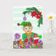 Feliz tarjeta navideña con un elfo caprichoso a mano, caramelos de vacaciones y un borde de pino y Poinsettia y una linda mano dibujada con un oso de peluche pegado.