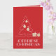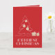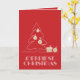Las palabras Navidades más meritorias con letras antiguas retro, un boceto de un árbol con ornamentos falsos de Relieve metalizado de oro y regalos aparecen en las tarjetas de felicitación de Navidades de vacaciones doblados rojos. COINCIDIENDO con los artículos de nuestra tienda.